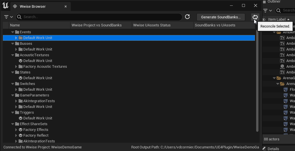 The Wwise Unreal plug-in includes a Commandlet you can use to reconcile all UAssets. To make sure the Assets are properly reconciled, we recommend that you run the GenerateSoundBanks commandlet before the WwiseReconcileCommandlet.