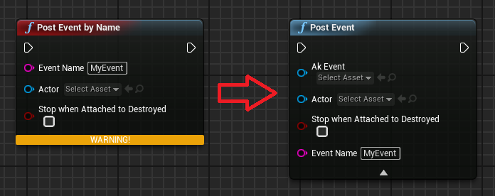 Starting with the 4.11 version of the Wwise Unreal plug-in, all "...by Name" methods (for example, PostEventByName or LoadBankByName) are deprecated. It is still possible to use strings to post Events or load SoundBanks by using the advanced fields in the Blueprint nodes. For example, if you wish to post an Event by name, you should now use the "Event Name" field of the "PostEvent" Blueprint node:
