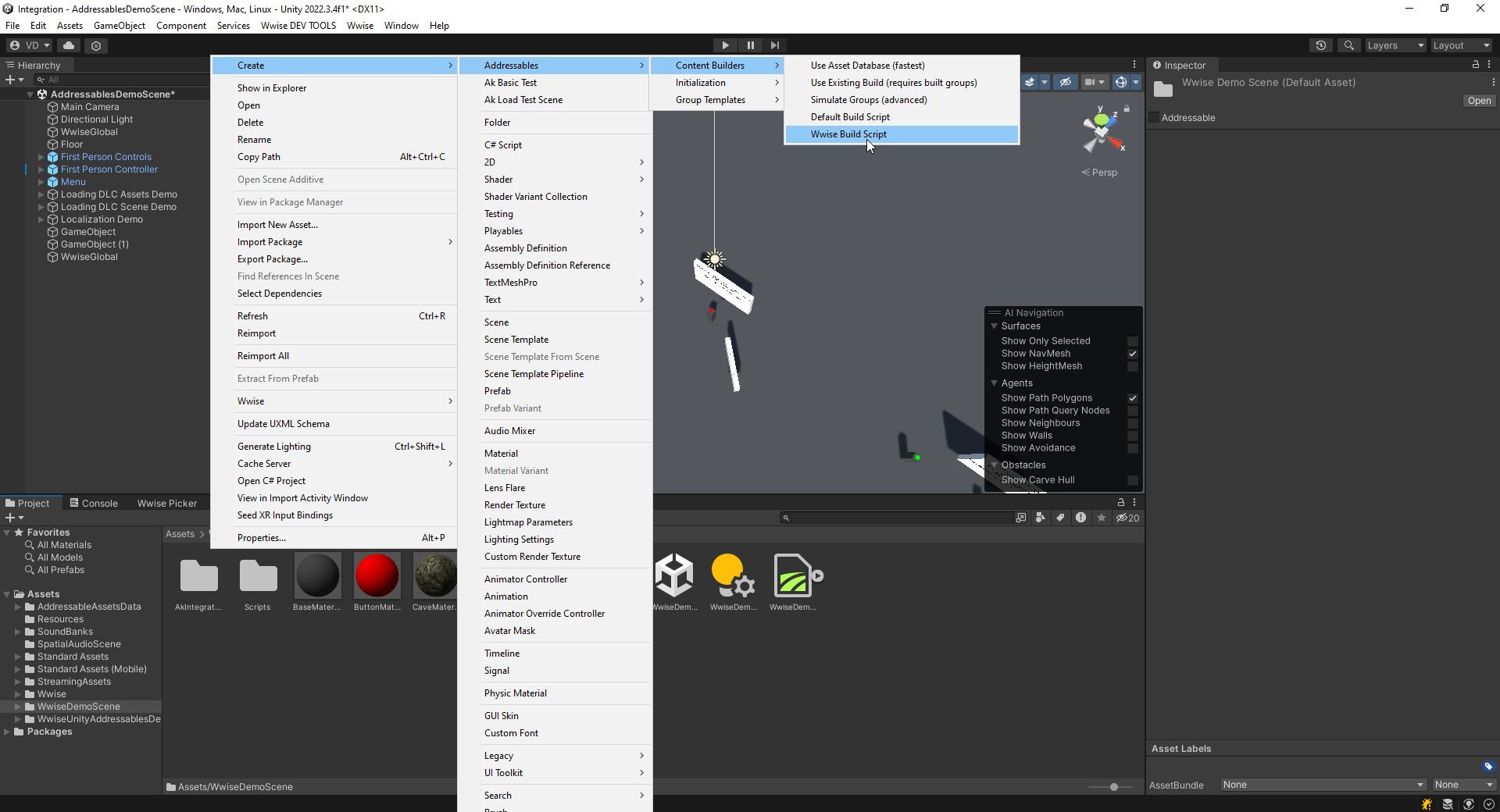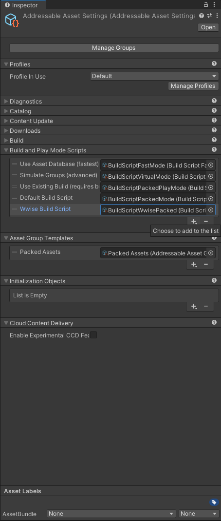 Step 6: Add BuildScriptWwisePacked to the Addressables build scripts. In the inspector for AddressableAssetSettings, add the BuildScriptWwisePacked asset you created in Step 4 to the Build and Play Mode scripts.