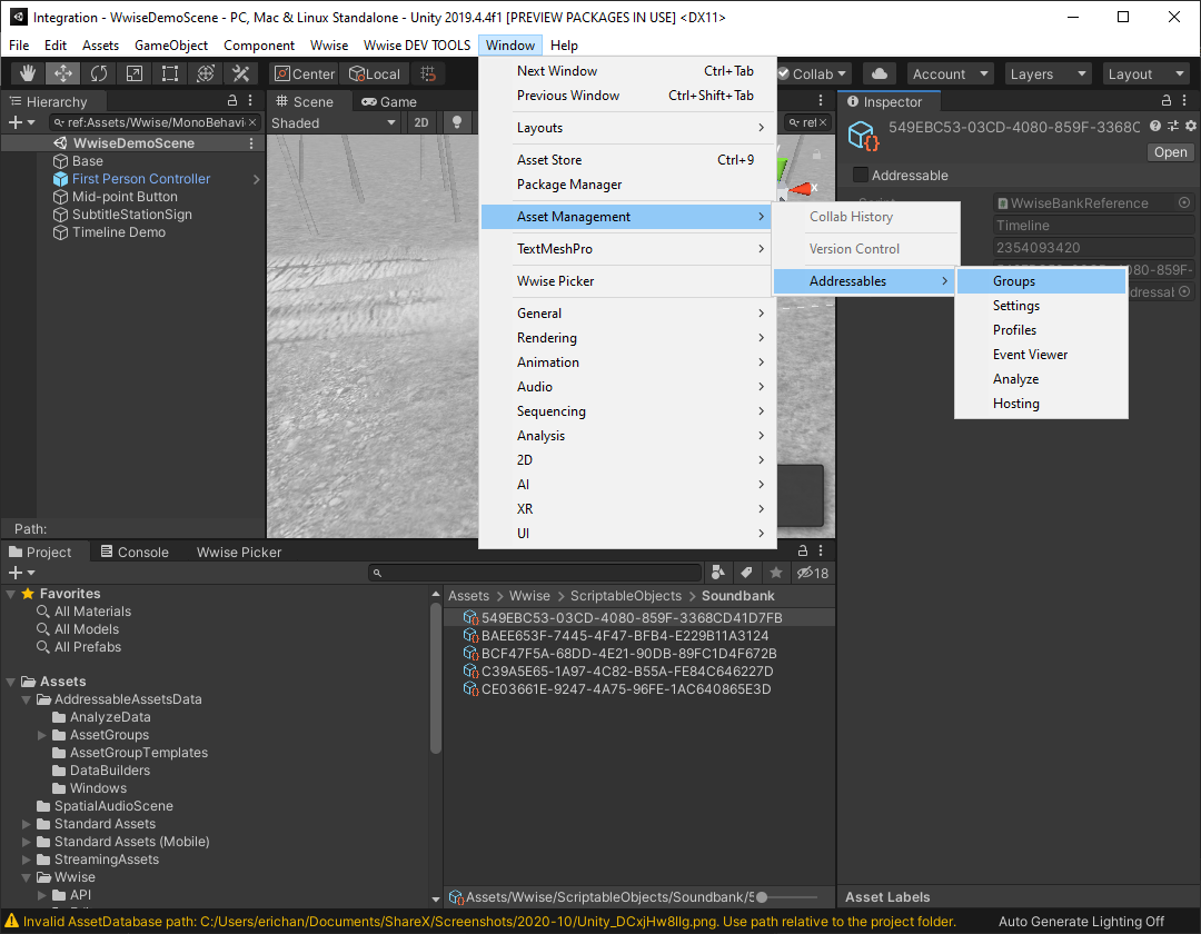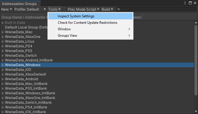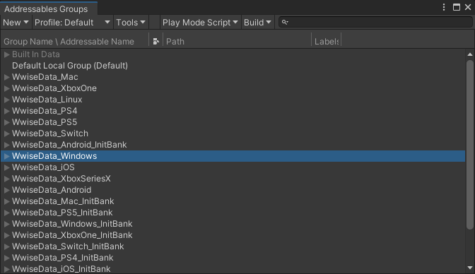 Step 3: Click Window > Asset Management > Addressables > Groups. The Wwise Addressables Groups window opens.