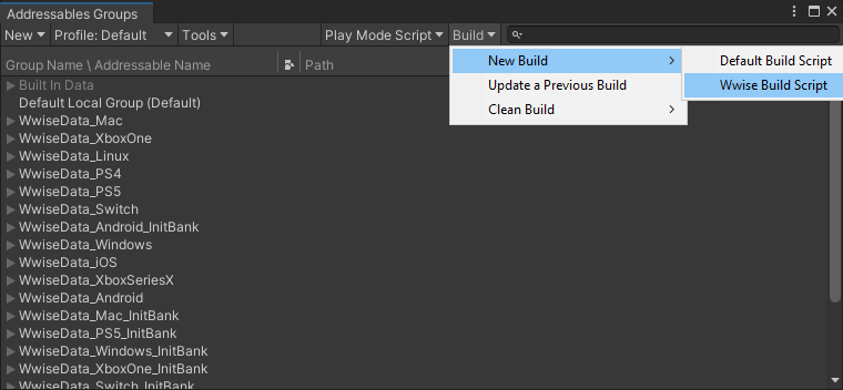 Build the Addressable asset bundles from the Groups window using the Wwise Build Script. This will generate all general asset bundles (e.g. Default Local Group) as well as platform specific asset bundles in Library\com.unity.Addressables\StreamingAssetsCopy\aa\<Platform Name>