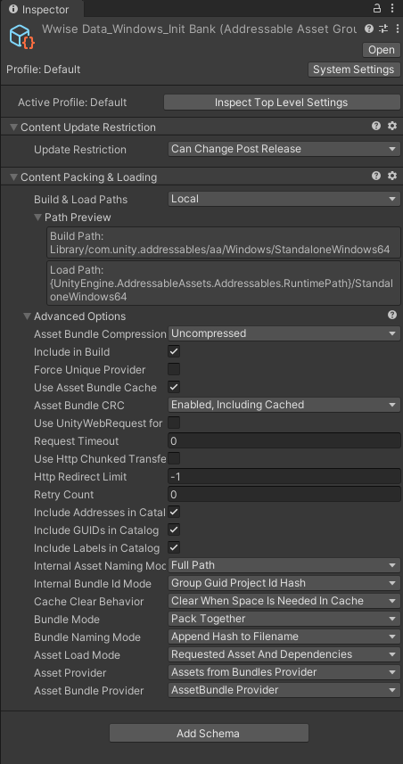 ![]() | Caution: You will have to rebuild the Addressable groups if you modify or add new SoundBanks to your project. Also remember to rebuild Addressable groups after you switch platforms. |