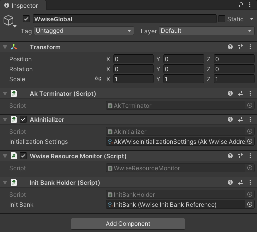 If you inspect the WwiseGlobal object in the scene, you will find that an Init Bank Holder component has been added to it.