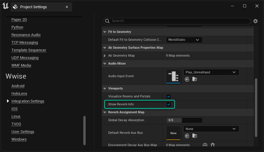 Information about the reverb parameters is displayed above any objects with attached Ak Late Reverb Components. You can enable or disable this text in the Wwise Integration Settings under Viewports - Show Reverb Info, or from the Unreal Level Editor Viewport menu.