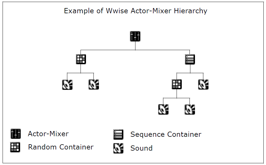 The Actor-Mixer Hierarchy groups and organizes all the sound and motion assets in your project. At the base of this hierarchy are all your individual sound and motion objects. You can define the properties and behaviors of these individual objects, but you can also take these objects and group them together so that you can define their properties and behaviors as a unit. To accommodate the complex nature of audio within a game, different types of objects can exist within the Wwise project hierarchy. Each object type has a set of properties, such as volume, pitch, and positioning, and a set of unique behaviors, such as random or sequence playback. By using different object types to group sounds within your project hierarchy, you can define specific playback behaviors of a group of sounds within the game. You can also define these properties and behaviors at different levels within the hierarchy to obtain different results.