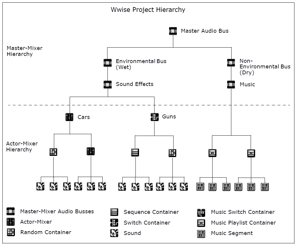 The Wwise project hierarchy consists of three distinct levels: