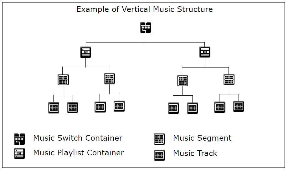 A vertical project structure is one in which you re-sequence the game score by shuffling the tracks contained in music segments. This is similar to the track mixing used in music production. It can help you make a varied score out of long, multi-tracked segments.