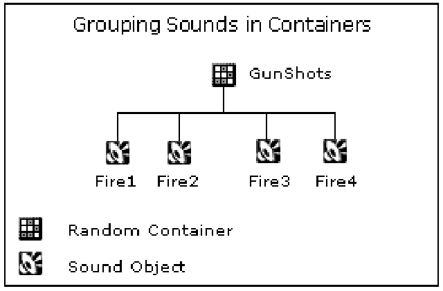 Containers are used to group the sound objects within your project. They are mainly used to play a group of objects according to a certain behavior, such as Random, Sequence, Switch, and so on. For example, you can group all the gun shot firing sounds into a Random Container so that a different sound will be played each time the gun is fired in game.
