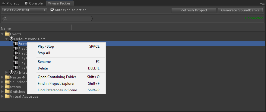 When in Wwise Authoring mode, modifications to the Wwise project are immediately reflected in the picker window. If you copy, rename, delete, or move an object in the Wwise Project Explorer, the contents of the Picker window will always correspond. There are also many additional features available when right clicking items in the picker window: