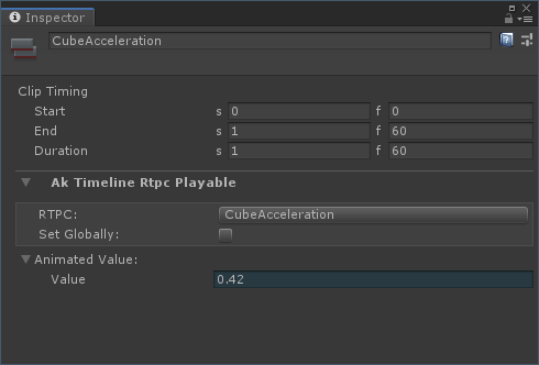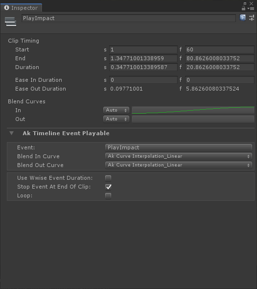 Ease In Duration is greater than zero.Ease Out Duration is greater than zero.The following properties are accessible from the inspector of an AkTimelineRtpcPlayable clip: