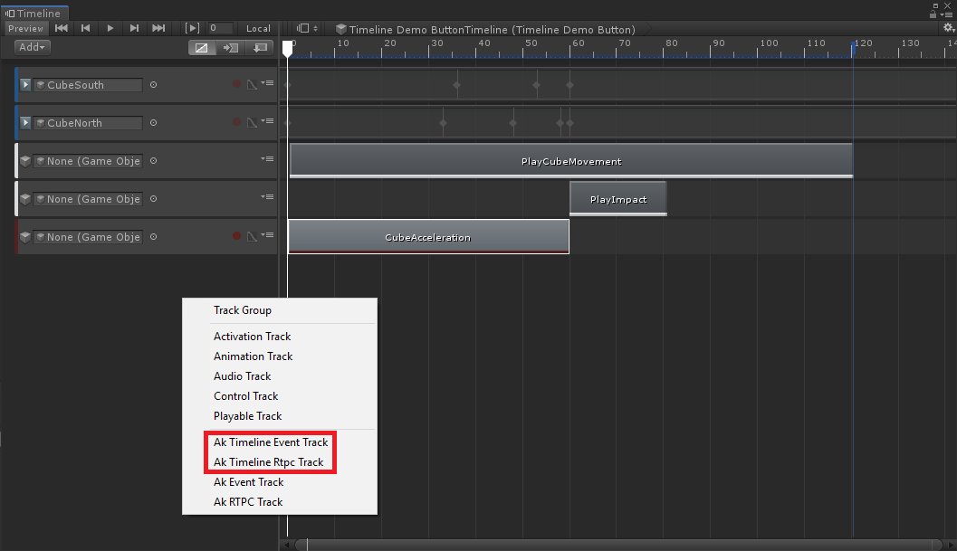 The Wwise Unity Integration adds two new Timeline tracks, the AkTimelineEventTrack and the AkTimelineRtpcTrack, and two deprecated Timeline tracks, the AkEventTrack and the AkRTPCTrack.