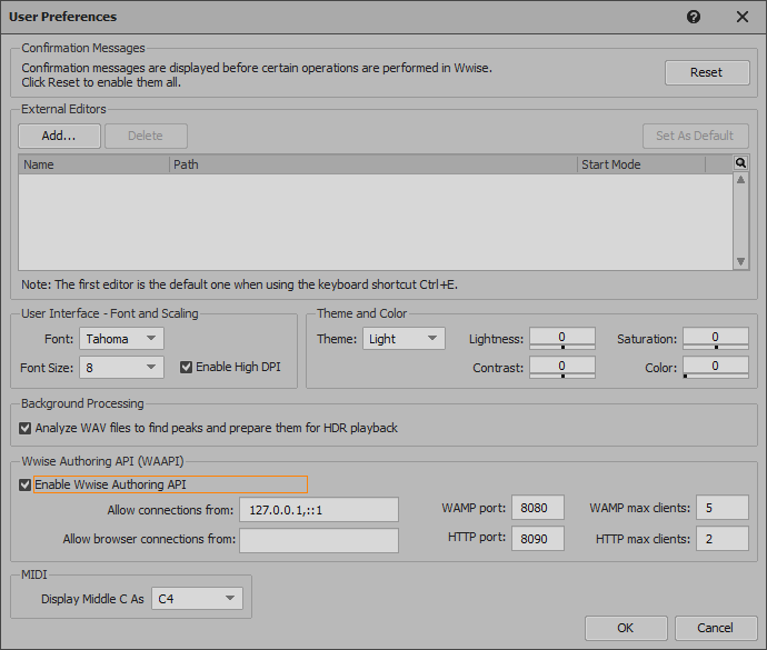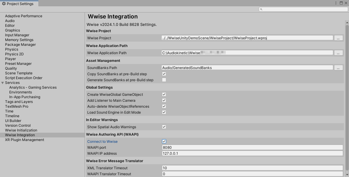 If the Connect to Wwise checkbox is unchecked, WAAPI functionalities will be disabled. By default, the WAAPI client will connect to port 8080 on the localhost (127.0.0.1). Changing these settings while WAAPI is connected will close the current connection and attempt to connect to the new target address.
