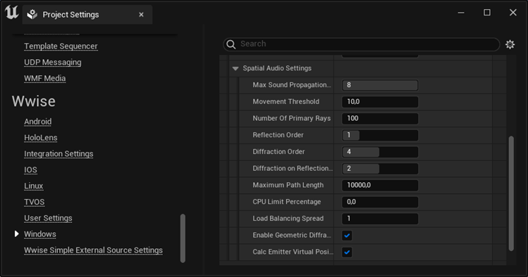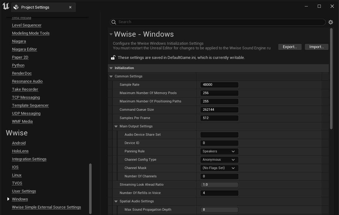 This section includes initialization settings for all of the supported Wwise platforms that are available in your Unreal Engine installation. Modifications to settings in editor will only be taken into account after restarting the editor; however, using the "Standalone" play mode will initialize a new instance of the SoundEngine with the current settings.