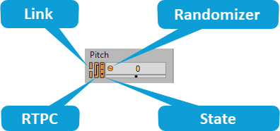 You may notice that certain property values in both the Property and Contents Editors have one or more indicators beside them. These indicators show whether the property value is linked to other active platforms, whether the property value is associated with RTPCs or States, and whether a Randomizer has been applied on the property value.