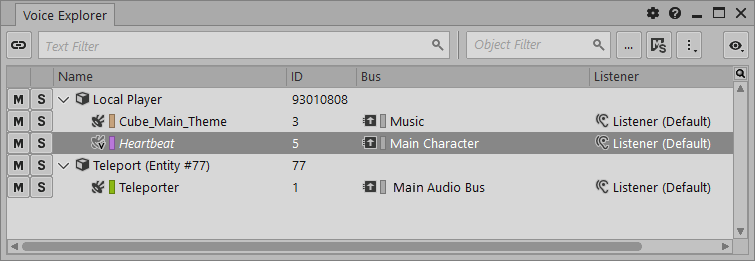 The Voice Explorer view contains all Game Objects that have at least one sound playing, whether physical or virtual, at a given time (specified by the time cursor of the Performance Monitor/Voice Monitor). One or multiple active sounds can be displayed under their corresponding Game Objects. When multiple instances of the same sound are currently playing on the same Game Object, the sound name appears multiple times under the Game Object. However, each instance has a different ID and its own Volume/LPF/HPF/DSF profiled independently.