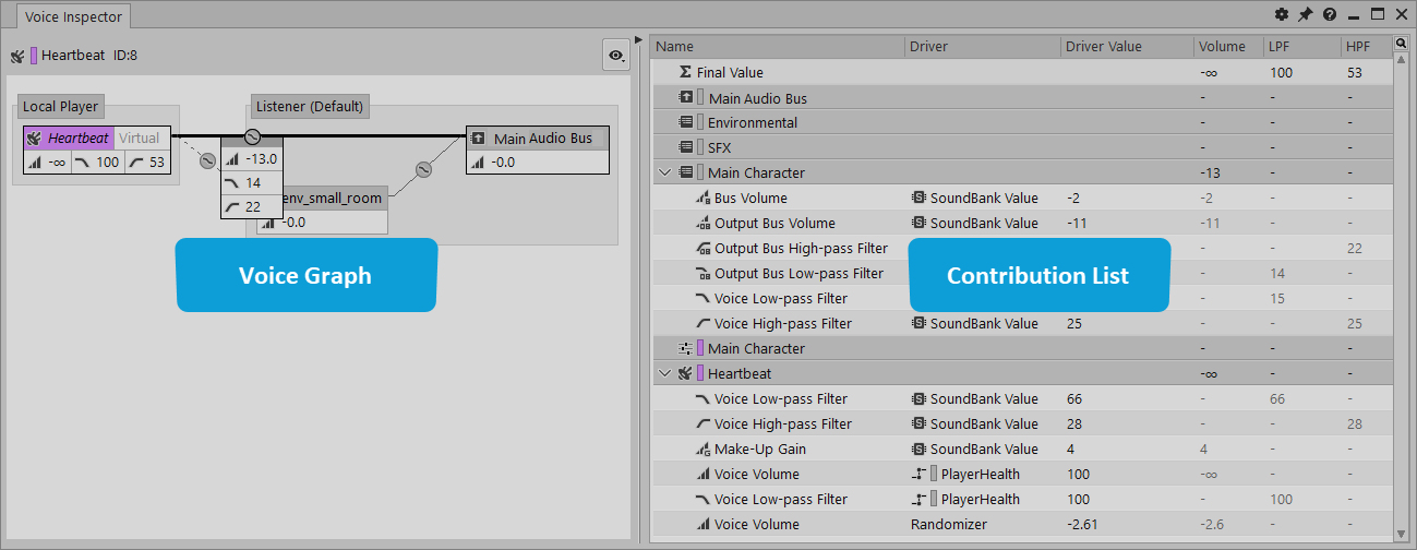 Once a sound is selected in the Voice Explorer, its full signal flow voice is displayed in the left panel, the Voice Graph, of the Voice Inspector view. Selecting a node in the graph displays a specific voice path, which will update the right panel, the Contribution List, accordingly.