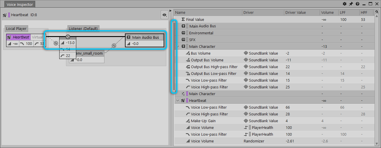 RTPC: Changes due to RTPCs are shown with the Game Parameter as the Driver and the value of the parameter at the current time will be listed in the Driver Value column. The corresponding change, once the RTPC curve transforms the value, appears in the Volume, LPF, HPF, or DSF column.