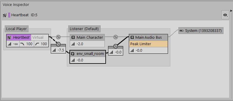 Room Bus Normalization: Auxiliary buses used in Spatial Audio to represent a room will normalize their output across the number of outgoing connections from that bus. A Room bus with two outgoing connections, for example, will often report -6 dB in the Voice Graph when you select either of those outgoing connections. This normalization is not otherwise reported in the Contribution List.