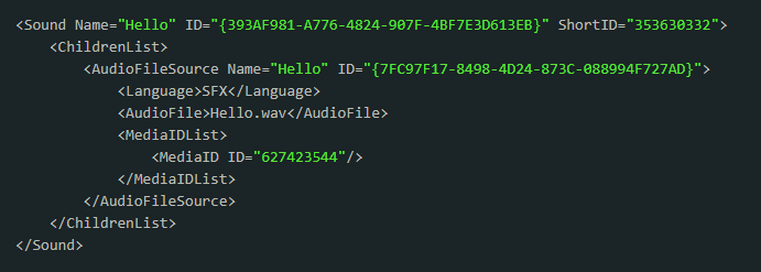All media assets are given a unique explicit ShortID. As such, they are random numbers and must be tracked in the Work Units. In the example above, the Sound's media is tracked via the AudioFileSource object, and the ID assigned to it is tracked via the MediaID entry.