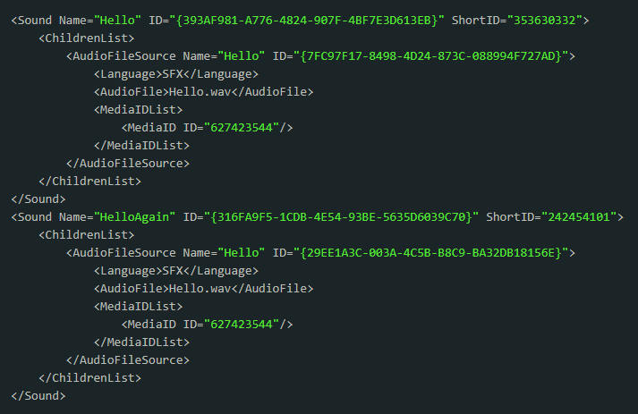 We can see how both Sound objects have been given the same MediaID. That's because both Sound objects use the exact same media asset. After all, there is no sense in shipping your game with multiple copies of the same media asset. Two instances of the same audio asset are considered identical only if they lead to identical .wem files. This means: