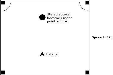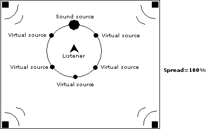 When spread is used, new “virtual sources” are defined that are offset from the original source. For example, for small spread values, a virtual source will be computed to the left and to the right of the real position and their contribution will be added to the speakers, in exactly the same way as the normal no-spread sounds, only in a slightly different position.