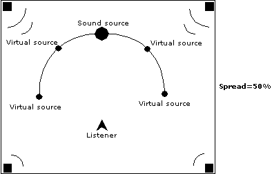 As the spread value increases, there will be more of those virtual sources to cover a larger arc around the listener. Obviously, the power of those sources is lower than the real source to maintain the total power constant.