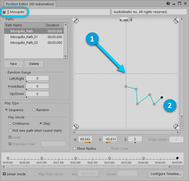 Whether you select Emitter with Automation or Listener with Automation, in the Position Editor, you can define a variety of paths for the mosquito sound to follow: