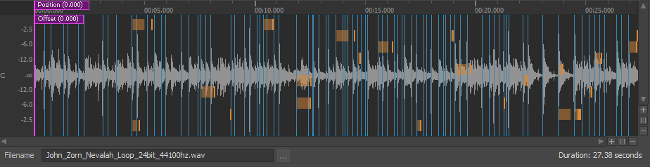 The Waveform view displays a channel downmixed view of the audio file waveform used by the plug-in. You may load a new audio file using the browse […] button to the right of the Filename field.