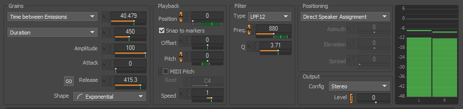 The Playback group exposes controls to define position in the source audio file where grains are read. Position defines the start position of grains in the source audio file, in percentage of the file's duration. Then the file is read sequentially, in the direction and at a speed that is dictated by Speed and Pitch. An absolute Speed value above or below 1 will result in, respectively, an audible positive or negative Pitch shift. With negative Speed, the source audio file is read backwards.