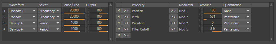 Soundseed Grain features 4 LFO / Randomizers, which can be assigned to any or all properties. The main characteristic of these so-called Grain Modulators, besides being embedded in the granular synthesizer's settings window, is that they take a value that persists for the whole duration of a grain. For example, if you assign a grain modulator to the Filter Cutoff, each grain's filter cutoff will remain the same for the whole duration of the grain. On the other hand, it honors very high frequencies, so if the emission rate is very large, say, every 100 microsecond, a new, accurate value will be returned for every grain. These "LFOs" affect properties once per grain, but are not bound to the control rate of Wwise (the sound engine's buffer size) and may do so as fast as is needed.
