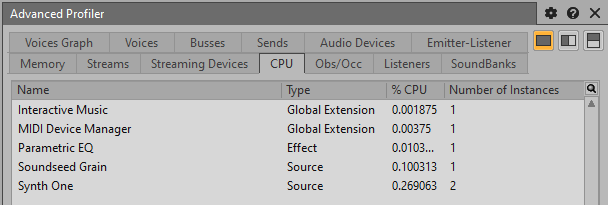 In the Advanced Profiler, the CPU tab displays all of the elements that contributed to CPU usage during the session. You can then identify which plug-ins, audio codecs, Effects, and so on use the most CPU resources.