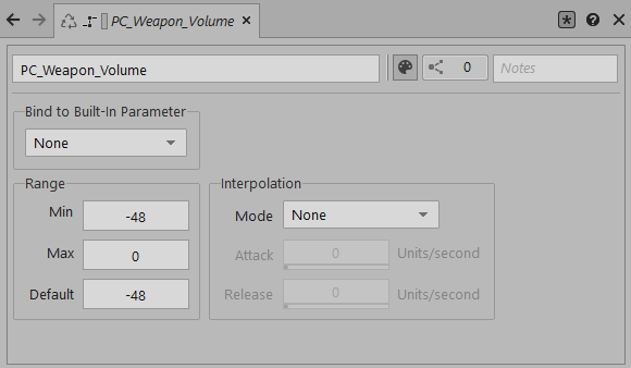 Create a Game Parameter: The first operation consists of creating a game parameter (i.e. PC_Weapon_Volume) and providing a range from -48 to 0, which represents a plausible dynamic range for a game. This game parameter will operate as a communication channel between the busses.