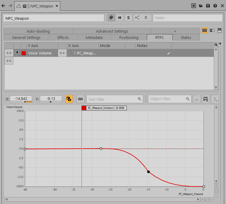 Create an RTPC curve: The third and final step consists of creating an RTPC curve on the bus to be attenuated. In this example, the bus volume is attached to the PC_Weapon_Volume game parameter and then an attenuation curve is created. The "x" axis represents the calculated RMS signal from the Meter Effect, and the "y" axis represents how much the volume of the NPC Weapon Audio Bus will be attenuated.