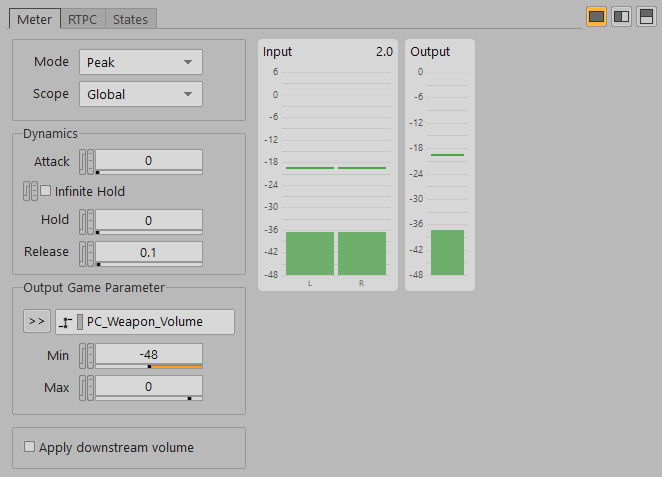 The Meter Effect monitors the input audio signal. When the Effect is used for side-chaining, the Mode, Attack, Release, and Hold parameters are used to slow down the response speed of the output signal and to send smoothed values to a game parameter, in this case, to the PC_Weapon_Volume.