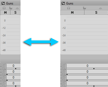 ミキサーストリップを全体的に大きくするには、Ctrlキーを押しながらマウスのスクロールホイールを上にスクロールするか、 スクロールバーの横にある「+」クリックする。