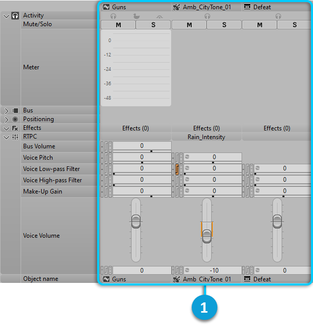 After you have created your Mixing Session, you can start populating it with the busses and/or individual objects within your project. Mixing Deskにバスやオブジェクトを1つ追加すると、ミキサーストリップ(Mixing strip)が1つ、作成されます。ミキサーストリップには、そのオブジェクトまたはバスの、プロパティ設定の概要が表示されます。また、複数のコントロール機能があり、様々なアクティビティをモニターできるほか、プロパティの変更、エフェクトやStateの設定、ポジショニングのプロパティ設定などができます。