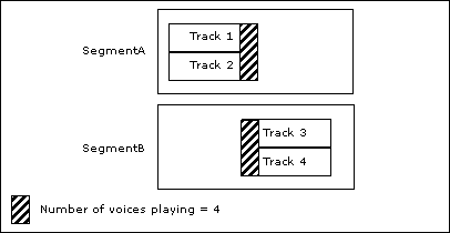 例えば、非常に帯域幅が制限されたゲーム用に、ミュージックを作曲する場合を考えます。同時に再生できるボイスは最高4つ、と指示されたとします。この場合、最上位の親オブジェクトの再生制限(Playback limit)を「4」に設定します。1つのMusic Segmentに入れるトラック数を2つ以下としたので、トランジション中に2つのトラックでそれぞれプレエントリとポストエグジットの部分が再生されても、2つのボイスしか再生されません。このようにすれば、同時に2つのセグメントが再生されるとしても、再生制限数の「4」以下となります。