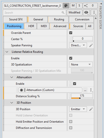 The Positioning category contains positioning properties of the selected object. オブジェクトに、スピーカーパンニングだけ、または3Dポジショニングだけ、または両者の組み合わせを適用するのかを、選びます。You can then define how each of these types of positioning is implemented. オブジェクトのオーディオスループットについて、センタースピーカーから再生する割合(%)も指定できます。