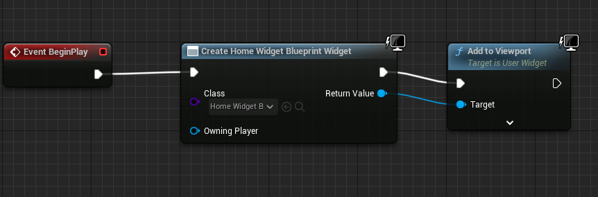Connect the execution signal of these three nodes and the Widget Return Value to the Target of the Add to Viewport node.